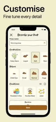 Customize Your Experience: Give your poop the personality it deserves with cartoon-like drawings and hilarious conditions. From fiery exits to monumental achievements, customize your logs for that personal touch.