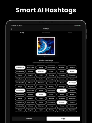 Search keywords to get a group of related hashtags for your post efficiently. Or you can simply upload a picture and generate AI tags based on the elements in your picture. Don’t worry about finding out effective hashtags one by one any longer.