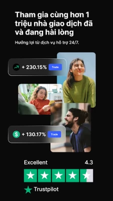 Hãy an tâm giao dịch vì nền tảng của chúng tôi được hơn 1.000.000 người dùng trên toàn thế giới tin tưởng. Chúng tôi cung cấp nhiều sản phẩm xuất sắc từng đạt giải thưởng, luôn đề cao khía cạnh bảo mật và còn có dịch vụ hỗ trợ 24/7 thân thiện.