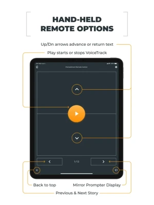 The Remote Control allows you to mirror the screen of your prompter display so that the content of the teleprompter display can be viewed and re-positioned from a distance.