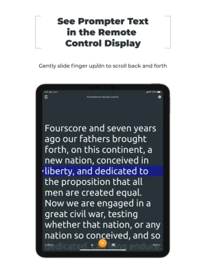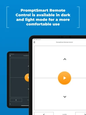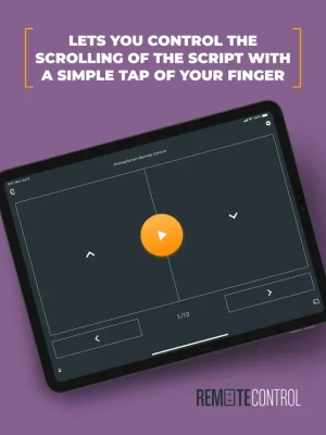PromptSmart Pro Remote Control is an optional, companion app to the PromptSmart Pro teleprompter app (subscription required) that lets you control the scrolling of your content with a simple tap of your finger to move it forward or backward, start/stop your presentations, and return to the beginning via a WIFI connection or mobile hotspot.