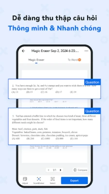 Bạn đang muốn cải thiện quá trình học tập của mình? Sử dụng Quiz AI để quét tài liệu học tập của bạn, chẳng hạn như ghi chú hoặc bài tập thực hành, và tự động xóa chữ viết tay, biến chúng thành bản sao kỹ thuật số sạch sẽ. Chọn và sắp xếp các câu hỏi theo chủ đề để tạo hướng dẫn học tập được cá nhân hóa và nâng cao hiệu quả học tập của bạn.