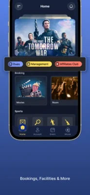 CLUB FEATURES ——————————————— - Home screen with updates - Member Registration / Login - Club Information - Notifications - Messages / News - Events - Movies - Facility information - Contact Information - Provide your Feedback