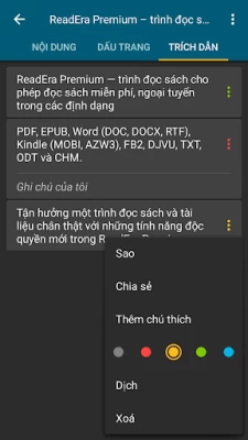 Mục "Đoạn trích và Ghi chú". Tất cả đoạn trích, ghi chú, dấu trang và đánh giá từ tất cả sách và tài liệu được sưu tập tại một nơi. Mục độc quyền trong menu ReadEra Premium.