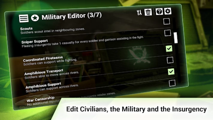 Want to create a governor with elite exo-skeleton soldiers, a charitable do-gooder who gives free healthcare to the masses or a tyrant who stamps out corruption with secret police? How about a challenge where you only have airstrikes, all initiatives cost reputation and every zone has an insurgent ambush lying in wait?