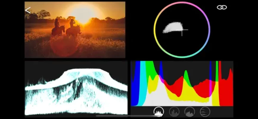 - Vectorscope: Displays color saturation, by channel, across the entire image.