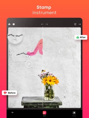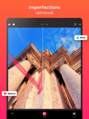 The app declutters photo imperfections and retouches them in an extremely simplified, yet smart way. The editor makes sure that the chosen area is erased without the photo distortion and is repaired appropriately.