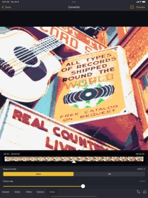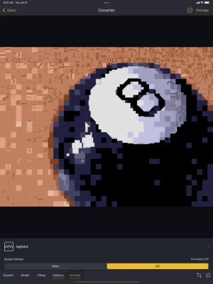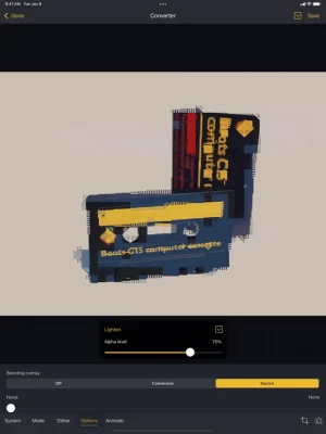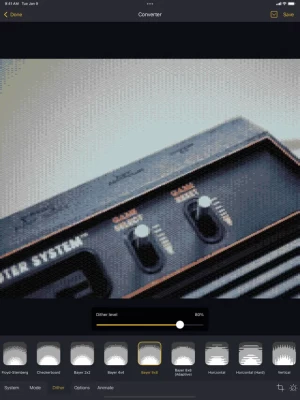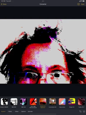 Simply take a picture (or select one from your photo library) and you can display it as it would appear on over forty systems including the Sinclair ZX Spectrum, Commodore 64, IBM PC (DOS, CGA, EGA and VGA), Commodore Amiga, Atari ST, Sega Mega Drive, Nintendo Game Boy and even the original 1984 model Apple Macintosh. If that's not enough you can also create your own custom modes based around four different graphics engines and a wide variety of colour palettes and character fonts. (The free version only contains a limited number of systems/dither modes and the custom editors, video clip processing and animation options aren't available.)