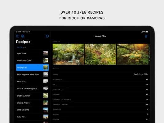 Ricoh Recipes is a free app that gives you access to over 40 JPEG Recipes for Ricoh GR cameras! These JPEG settings allow you to get various looks straight out of camera, many inspired by film stocks and analog aesthetics. No need to edit! If you have a Ricoh GR, GR II, GR III, or GR IIIx camera, there are JPEG Recipes in this app that are compatible with your gear—it's a great resource for Ricoh GR photographers! Simply select the recipe you want, adjust the JPEG settings as required, and shoot!