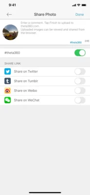 You can share on Twitter, Facebook, and other social network services the spherical images you shoot.