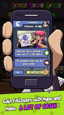 The life of a guitarist is all about energy, rock, and music – just like in Guitar Hero! Evolve your character by making decisions, improving your guitar skills, and connecting with followers. Collect fans and turn them into income – they’ll help fund your career and bring in money through your performances.