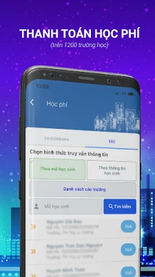 SAIGONBANK PAY là ứng dụng thanh toán thông minh mang đến cho người dùng nhiều tiện tích hấp dẫn với việc sử dụng thẻ của 47 ngân hàng trong hệ thống NAPAS để thanh toán học phí, viện phí, hóa đơn điện, nước, ngoài ra còn tra cứu lãi suất, tỷ giá, địa điểm ATM,... Ứng dụng SAIGONBANK PAY giúp người dùng thực hiện các giao dịch nhanh chóng, mọi lúc, mọi nơi thông qua chiếc điện thoại thông minh Smartphone có kết nối wifi, 3g,... Thao tác đăng ký đơn giản chỉ với số điện thoại và xác thực OTP từ SAIGONBANK Với SAIGONBANK PAY – quên đi nỗi lo xếp hàng, thanh toán chưa bao giờ dễ dàng hơn thế.