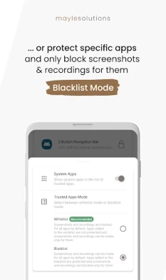Go to Trusted Apps → Tap the three dots (top right) → Set Trusted Apps Mode to Blacklist. In this mode, screenshots and recordings are allowed for all apps except those on the blacklist, which remain hacker protected.