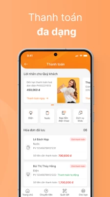 - Thanh toán hoá đơn điện, nước, nạp tiền điện thoại, nộp phí đường bộ, truyền hình cáp, Internet ADSL, điện thoại di động trả sau/cố định