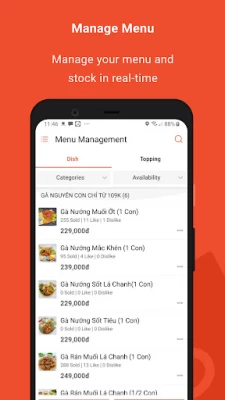 - Quản lý menu: thiết kế menu bằng cách tự thao tác cập nhật tên món, giá món, hình ảnh món, trạng thái còn/ tạm hết món trên thực đơn.