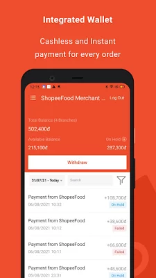 - Quản lý ví ShopeeFood Merchant Wallet: cải thiện thời gian thanh toán, kiểm tra, theo dõi, đối soát giao dịch bất kì lúc nào một cách dễ dàng, nhanh chóng và an toàn.