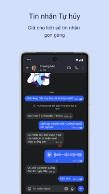 • Signal được xây dựng hướng đến quyền riêng tư. Chúng tôi không biết gì về bạn hoặc người bạn trò chuyện cùng. Giao thức mã nguồn mở Signal Protocol của chúng tôi đồng nghĩa với việc chúng tôi không thể đọc tin nhắn hoặc nghe cuộc gọi của bạn. Và cũng không ai khác có thể làm điều đó. Không lỗ hổng, không thu thập dữ liệu, không theo dõi.