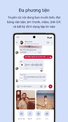 • Gửi tin nhắn văn bản, tin nhắn thoại, ảnh, video, nhãn dán, hình GIF, và tập tin miễn phí. Signal dùng kết nối dữ liệu trên điện thoại của bạn, để bạn không mất phí gửi SMS và MMS.