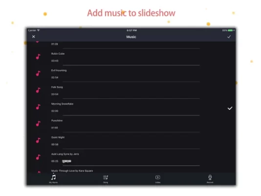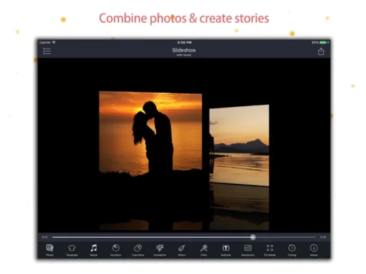 - 150+ stunning transitions - 50+ built-in music tracks to choose from - Photos can be kept with or without cropping - Support 1:1, 4:3, 16:9, etc resolution - 20+ moving animation and 30+ particle animation - Edit photo and music freely