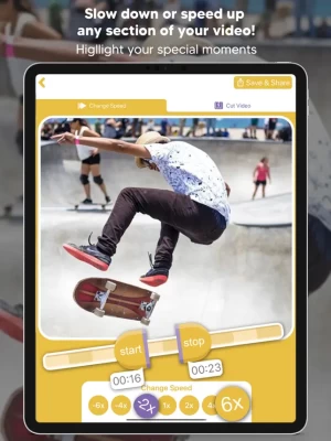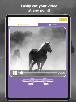 Easily highlight those special moments by changing the speed of the most important parts. Apply speed variations to any sections of your video. Determine when the slow motion or fast motion effect starts and when it ends. Easily control the speed of all your videos. Try out the fastest and easiest way to trim videos, slow down or speed them up. Make your videos look awesome on all social networks!