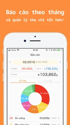 Khi bạn nhập vào một bản ghi thu hoặc chi, app sẽ tự động lập biểu đồ thu hoặc chi hàng tháng như một biểu đồ hình tròn để bạn dễ dàng nắm bắt sự cân bằng của thu nhập và chi tiêu.