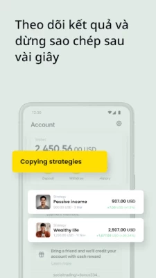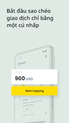 Giờ đây, bạn đã có thể thoải mái sao chép từ các nhà giao dịch ở khắp nơi trên thế giới tại chính ngôi nhà của mình. Nạp tiền nhanh với phương thức thanh toán tin cậy, theo dõi các nhà giao dịch mà bạn yêu thích, đầu tư trong vài giây và rút tiền tức thời.