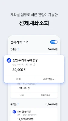 로그인 후 처음 만나는 메인화면에서 입출금, 예•적금, 신탁 계좌의 현황을 파악할 수 있어요.