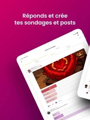 Have fun and enjoy good times with the community through created content. Share what you like and get maximum reactions & comments, whether written or audio. Access thousands of polls, photo duels & publications, allowing you to express your opinion and see that of the community.