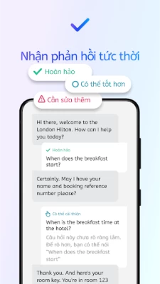 Nhờ công nghệ AI tiên tiến nhất của chúng tôi, bạn có thể luyện tập mọi lúc mọi nơi và được nhận phản hồi tức thời về cách phát âm, ngữ pháp và nhiều hơn thế nữa.