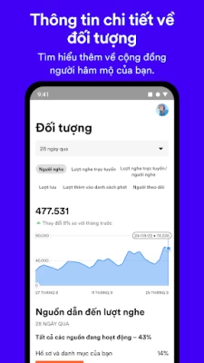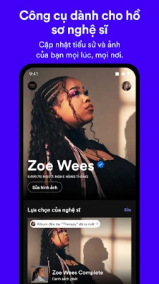 Ứng dụng chính thức của Spotify giúp các nghệ sĩ giống như bạn phát triển cộng đồng người hâm mộ, xây dựng hoạt động kinh doanh và tạo nên một thế giới xoay quanh âm nhạc của bạn.