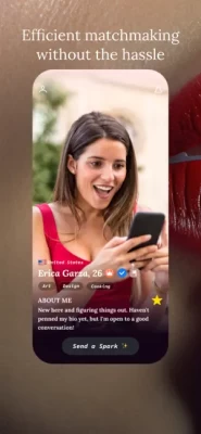In this user-friendly dating app, you simply scroll down to explore a curated selection of profiles tailored to your preferences. Each profile is showcased individually, allowing you to focus on one person at a time. If someone doesn't capture your interest, a swift upward swipe removes them from your view. Conversely, if you encounter someone you're drawn to, the "Say Hi" button at the bottom of the page enables you to initiate contact immediately, fostering a direct and meaningful connection.