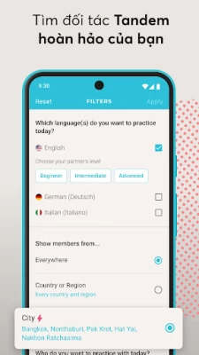 Dù mục tiêu học tập ngôn ngữ của bạn là gì, bạn đều có thể đạt được mục tiêu đó thông qua những cuộc trò chuyện thú vị và những người bạn mới. Rất đơn giản: chỉ cần chọn một ngôn ngữ, tìm một thành viên Tandem có cùng sở thích và bắt đầu thôi!