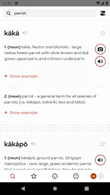 Te Aka is a Māori language dictionary that is easy to use by searching for Māori or English words. It includes the ability to filter search results, and to save definitions to a Favourites list. There are currently over 24,000 Māori headword entries in the database, which is being added to over time. An offline dictionary has also been included when internet connectivity is not available.