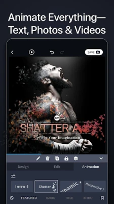 Work in real 3D space, add animation to text, photos, and videos—including the popular Shatter effect—and finish with built-in photo & video editing.