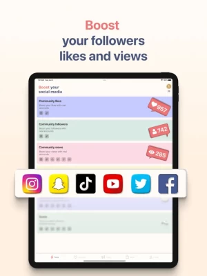 Boost your social media presence, the app allows you to boost your followers, likes and views in multiple social media with real accounts (Instagram, Tiktok, Snapchat, Facebook, Youtube, Twitter).