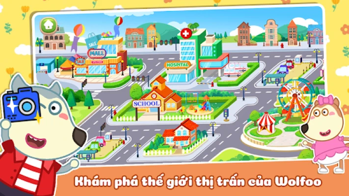 Hãy bắt đầu hành trình của sự khám phá sáng tạo, học hỏi tương tác và vui vẻ không ngừng trong Thị trấn mơ ước của Wolfoo.