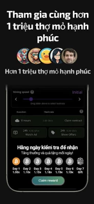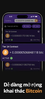 Bạn không cần phần cứng đắt tiền. Chỉ cần chọn tốc độ băm mà bạn mong muốn của máy đào Bitcoin và bắt đầu nhận BTC trực tiếp vào ví tiền mã hóa của bạn. Thử nghiệm với hợp đồng đào Bitcoin miễn phí của chúng tôi, chứng minh việc kiếm thu nhập thụ động thật đơn giản với ứng dụng của chúng tôi.