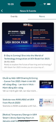 Tính năng nổi bật - Tìm và đăng ký tham gia các sự kiện. - Cập nhật tin tức và các tài liệu mới (bản in, bản điện tử, bài đăng tạp chí JABES-UEH). - Chỉ dẫn và cung cấp thông tin các khu vực chức năng trong thư viện (độ ồn, chất lượng không khí, độ ẩm và nhiệt độ). - Giờ mở cửa Thư viện; Đặt phòng học nhóm trực tuyến. - Tìm kiếm, gia hạn và đặt mượn tài liệu. - Quản lý tài khoản thư viện: tài liệu đang mượn, tài liệu quá hạn và thông tin cá nhân.