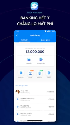 TNEX Merchant sở hữu đầy đủ những tính năng ngân hàng số với trải nghiệm hoàn toàn mới. Tạo tài khoản tại chỗ không cần ra chi nhánh ngân hàng; Mở thẻ; Chuyển khoản bằng số điện thoại và liên ngân hàng; Thanh toán với mã QR code,... Và quan trọng là, tất cả mọi thứ đều hoàn toàn miễn phí!