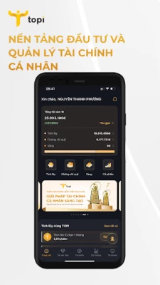 TOPI là một ứng dụng tài chính giúp bạn xây dựng tương lai bền vững thông qua các dịch vụ tài chính online như tích lũy, đầu tư chứng khoán, mua chứng chỉ quỹ và mua vàng.