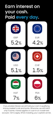 - High interest on your uninvested cash: 5.2% on GBP, 4.2% on EUR, 5.1% on USD, and more. Paid daily. Terms apply.