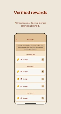 ✔️ Regular updates of rewards and Energy. ✔️ Links are tested before being published. ✔️ Easily view already claimed rewards at a glance. ✔️ Simple and user-friendly interface. ✔️ Notifications to keep you informed of new rewards. ✔️ Easily share rewards with your friends.