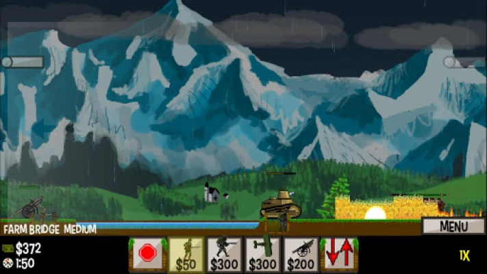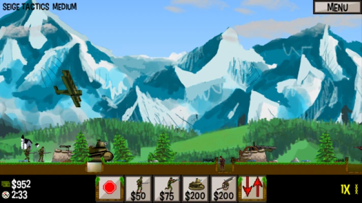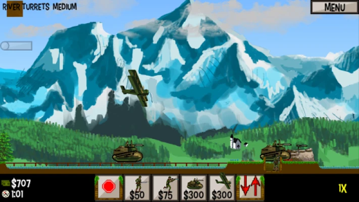 Units are recruited and controlled by pressing the buttons at the bottom of the screen. The rightmost button tells three troops to advance to the next trench, the leftmost button tells three troops to halt advancing. Soldiers, flamethrowers, and tanks are capable of advancing into enemy trenches, snipers and artillery will only advance when a trench has been claimed. To access elite units, press and slide up on the Sniper, Tank, and Artillery buttons.