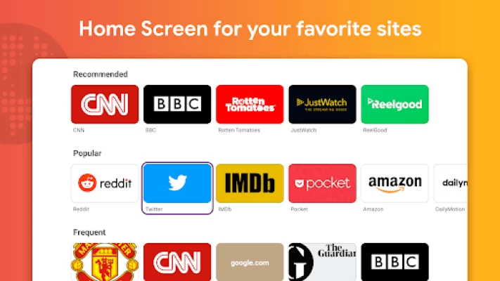 Màn hình chính của trình duyệt web giúp bạn dễ dàng truy cập các trang yêu thích. Thêm trang yêu thích của bạn trực tiếp vào Màn hình chính bằng một thao tác bấm, truy cập trực tiếp vào các trang truy cập gần đây và thường xuyên.