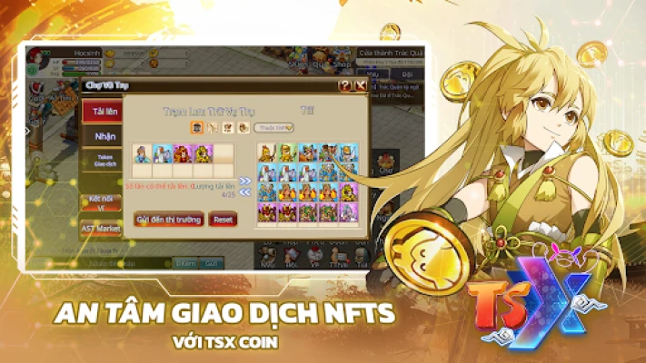 Hệ thống khai thác cho phép thu thập TSX Coin trong game. Càng khai thác nhiều, phần thưởng càng lớn! Quy đổi TSX Coin thành Token để giao dịch vật phẩm giá trị trên NFT Marketplace, mở ra cơ hội kiếm lợi nhuận thực tế!