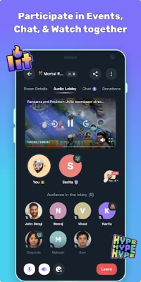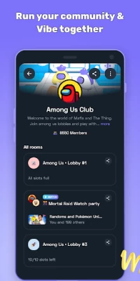 Tạo các club cho cộng đồng chơi game. Chơi các game như Among Us, Battlegrounds Mobile India BGMI, PUBG Mobile, Call of Duty Mobile CODM, Free Fire, Fortnite, Brawl Stars, Clash of Clans, eFootball, Mobile Legends, Clash Royale, Pokemon Unite, Minecraft, Roblox, Chess, Skribble, Ludo hoặc tổ chức sự kiện cho bạn bè, người đăng ký và người xem. Tận hưởng niềm vui tổ chức & tham gia các bữa tiệc theo dõi, nghe nhạc, live stream hoặc xem video YouTube cùng nhau. Live stream sự kiện lên kênh YouTube, trang Facebook hoặc kênh Twitch từ điện thoại di động và thêm lớp phủ hoạt ảnh tùy chỉnh trên stream.