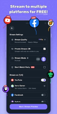 Tạo live stream game chất lượng chuyên nghiệp để có khoảnh khắc chơi game tuyệt vời nhất ngay từ điện thoại di động. Đúng vậy, chỉ cần điện thoại. Không cần Elgato hoặc PC/Laptop hay OBS. Phát tất cả game di động như Among Us, Battlegrounds Mobile India BGMI, PUBG Mobile, Call of Duty Mobile CODM, Free Fire, Fortnite, Brawl Stars, Clash of Clans, eFootball, Mobile Legends, Clash Royale, Pokemon GO, Pokemon Unite, GTA, Minecraft, Roblox, Chess, Skribble, Ludo. lên YouTube Live, Facebook Live và Twitch TV - cùng lúc và miễn phí! Đồng thời stream đến mọi nền tảng khác với RTMP streaming tùy chỉnh - Booyah, Trovo, v.v.
