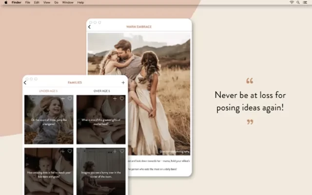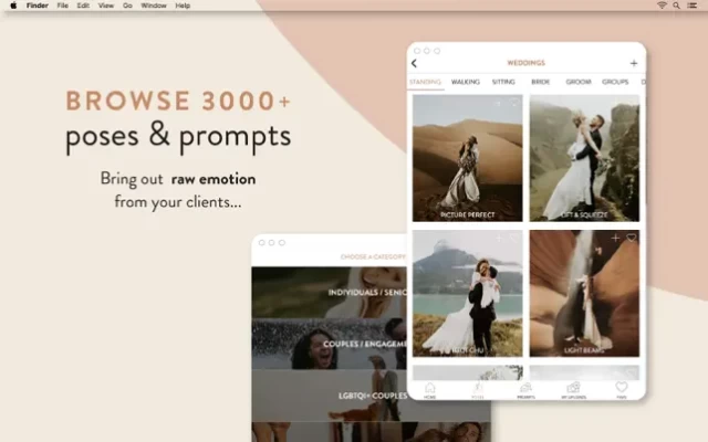 The Unscripted Posing App is filled with hundreds of emotive prompts & poses for every kind of photoshoot. Plus send clients digital invoices, contracts and questionnaires!