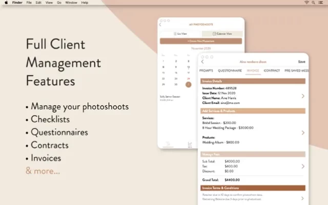*Create photoshoots and save client details, poses, questionnaires etc