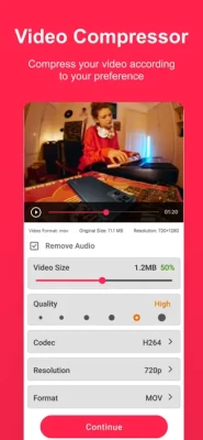 Features: # Compress videos with high/normal/low quality # Compress video # Fast forward and compress the video # Video to MP3 converter, can extract MP3 from video file # Use hardware codec, fast compression # Share videos # Batch compress images # Free and Easy-to-use